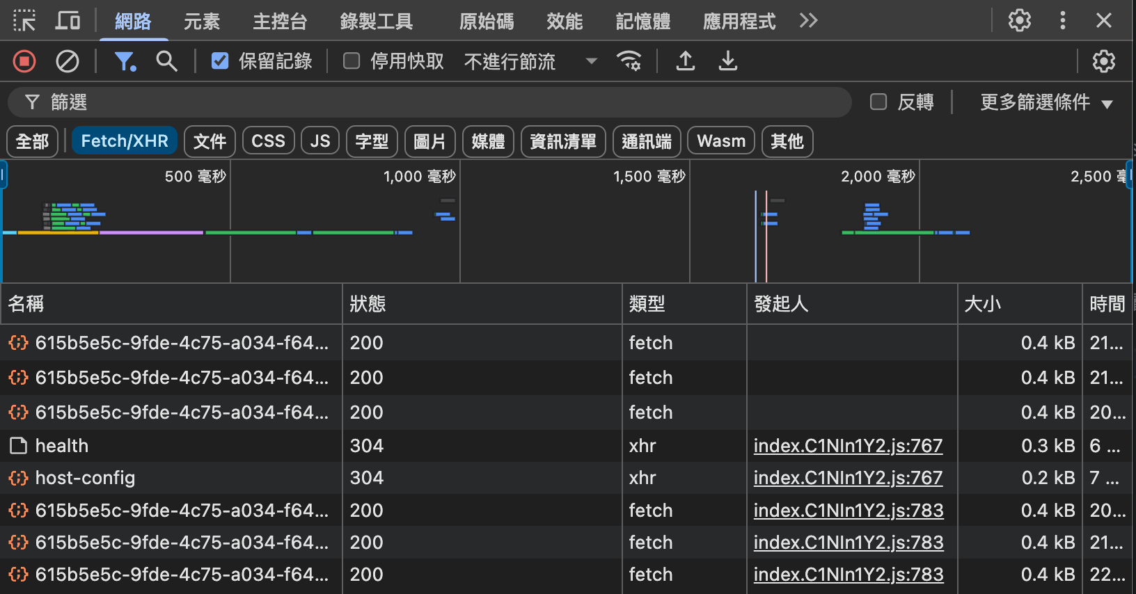 這邊可以看到有一個 HTTP 101 Upgrade 使用 WebSocket 的請求,代表瀏覽器已經和後端的伺服器建立了連線。